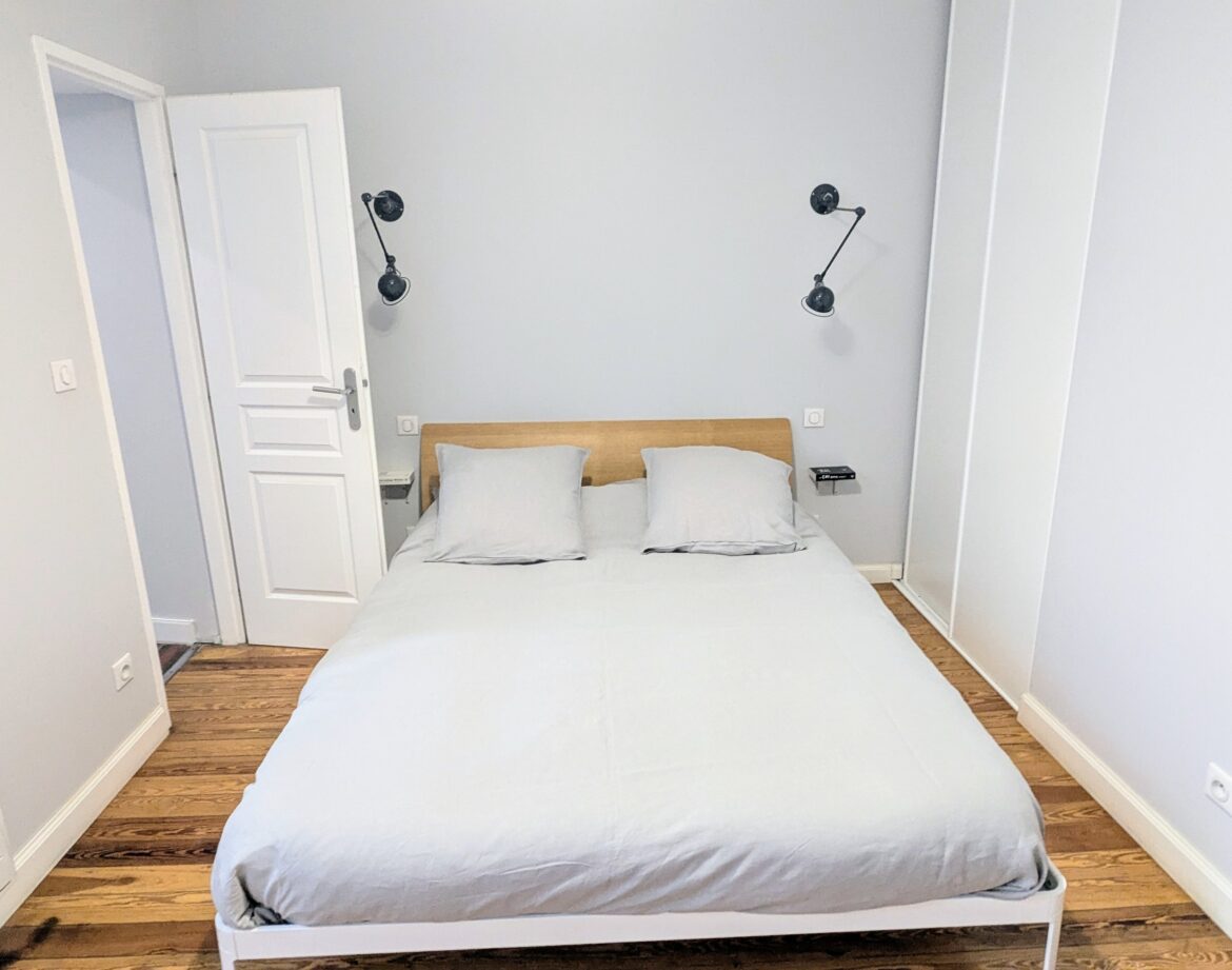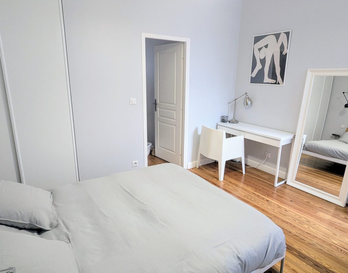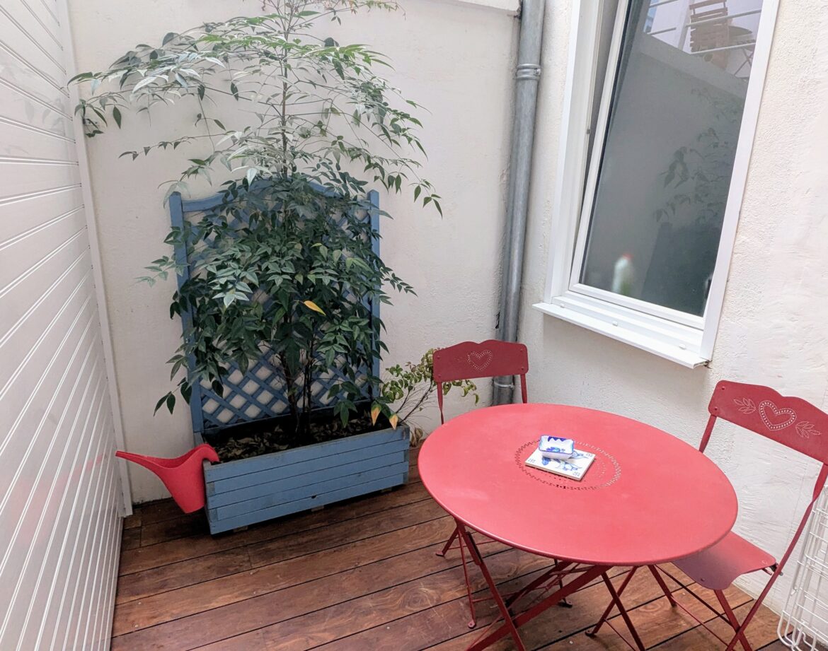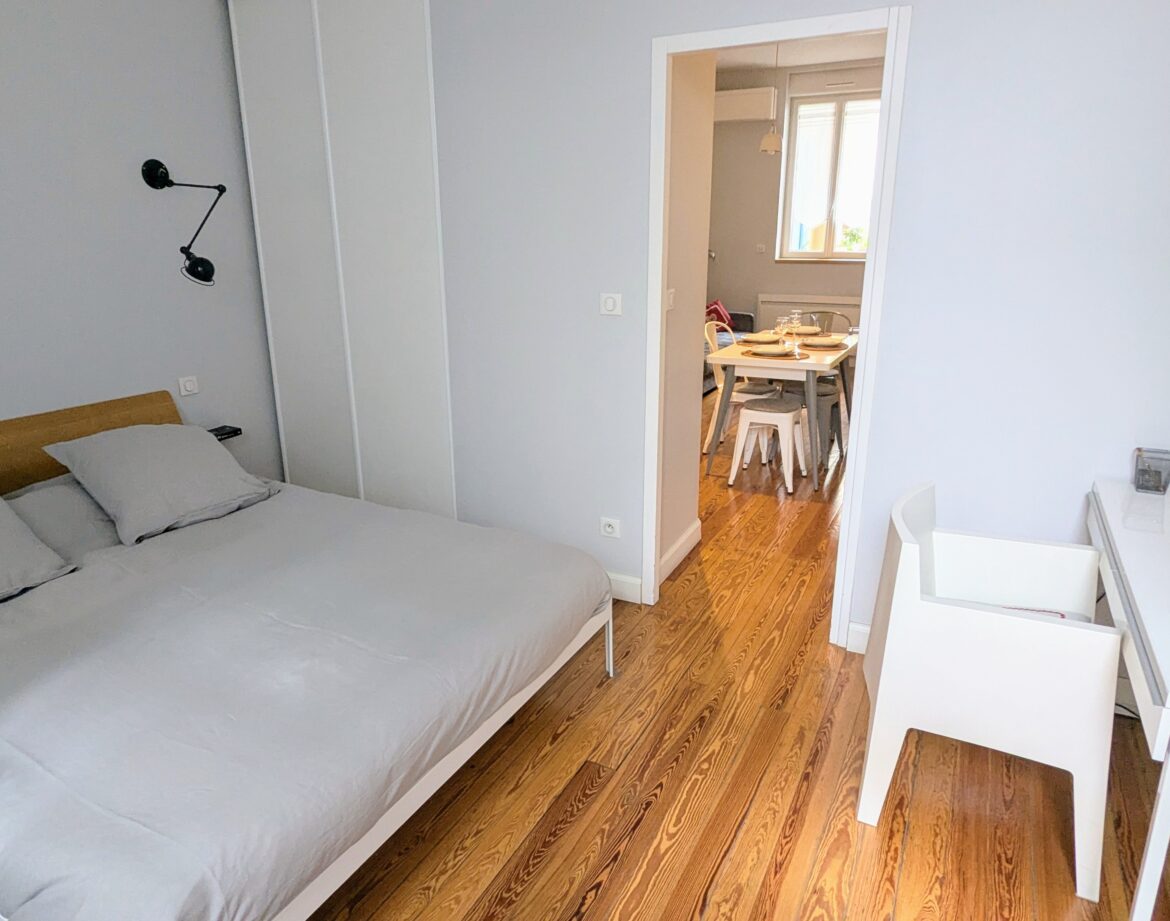 La chambre dispose d’un lit double (160 x 200 cm), de deux élégantes lampes murales Jieldé, d’un placard avec étagères et double penderie, d’un bureau avec fauteuil et d’un grand miroir.Elle s’ouvre, par une porte-fenêtre équipée d’un volet roulant électrique, sur une terrasse privative en bois exotique, aménagée avec un salon de jardin rouge, des chaises et une jardinière.