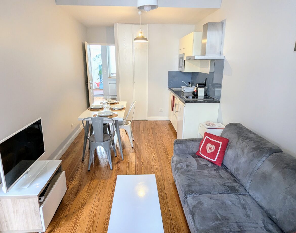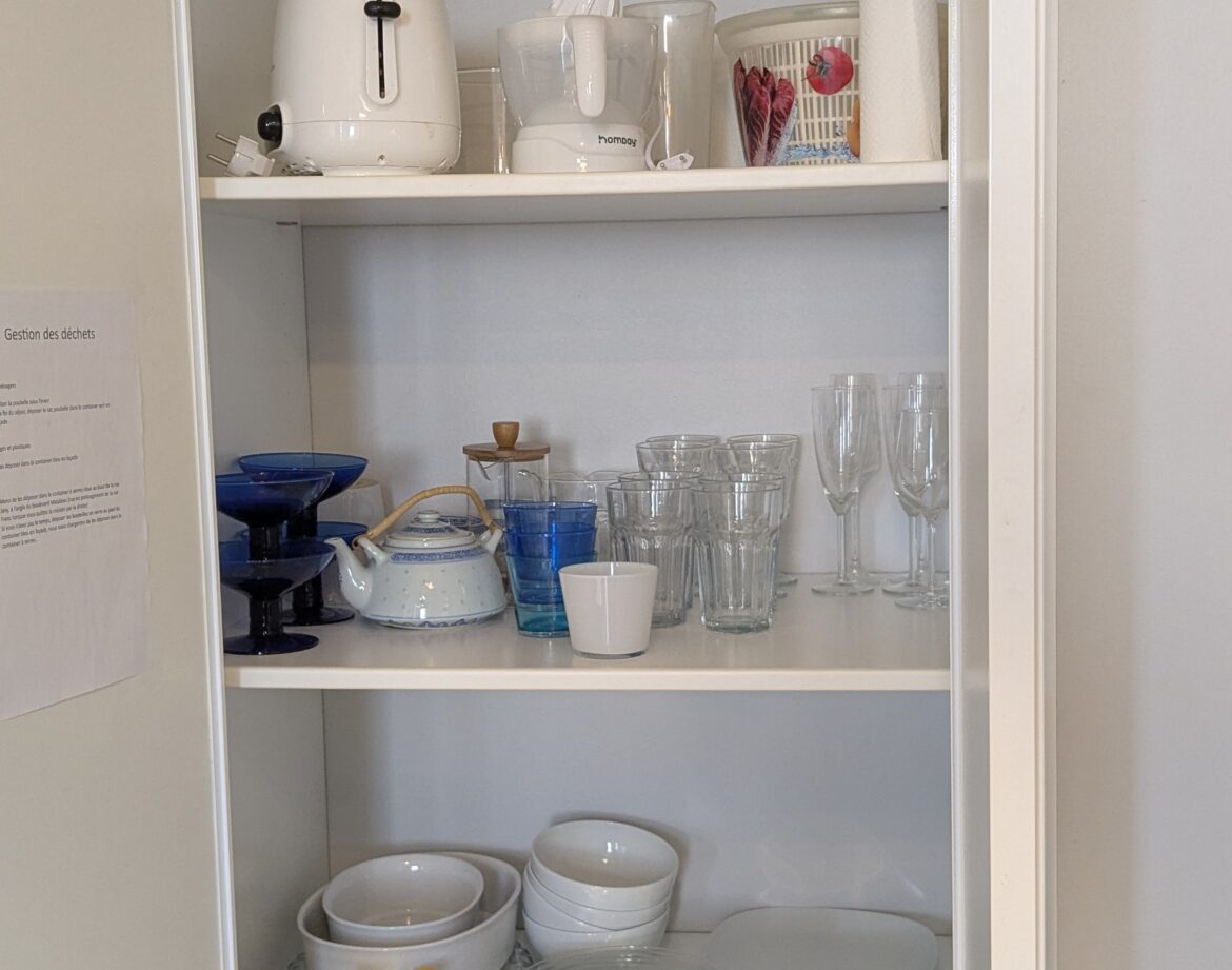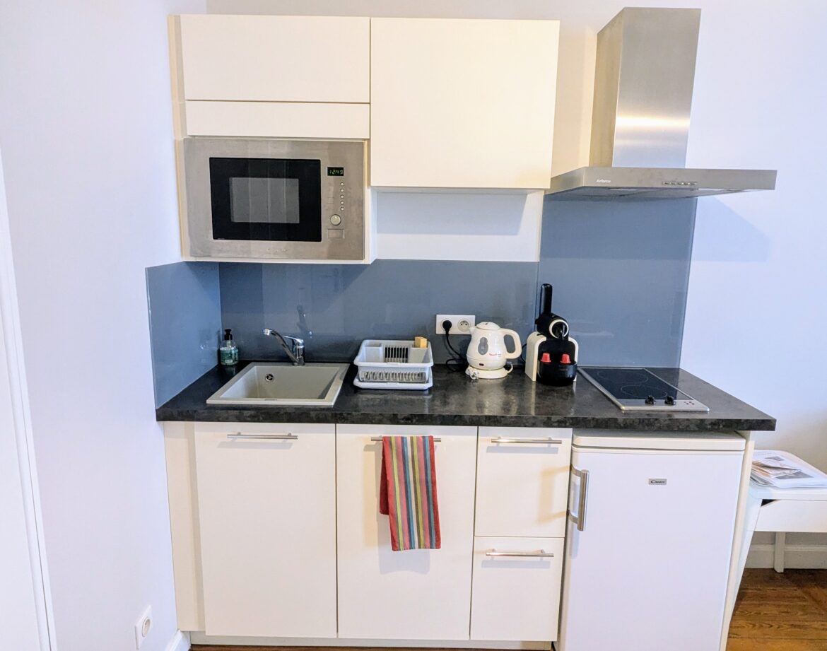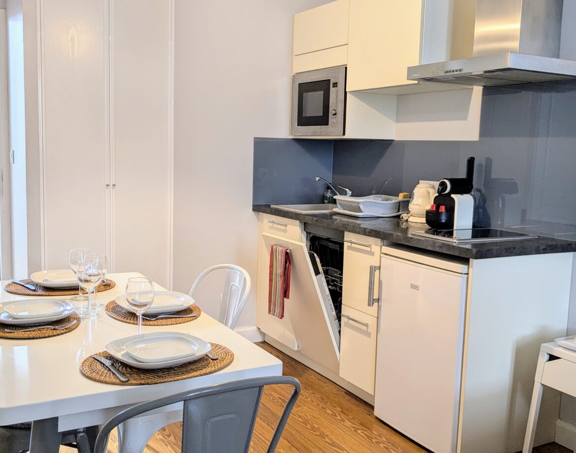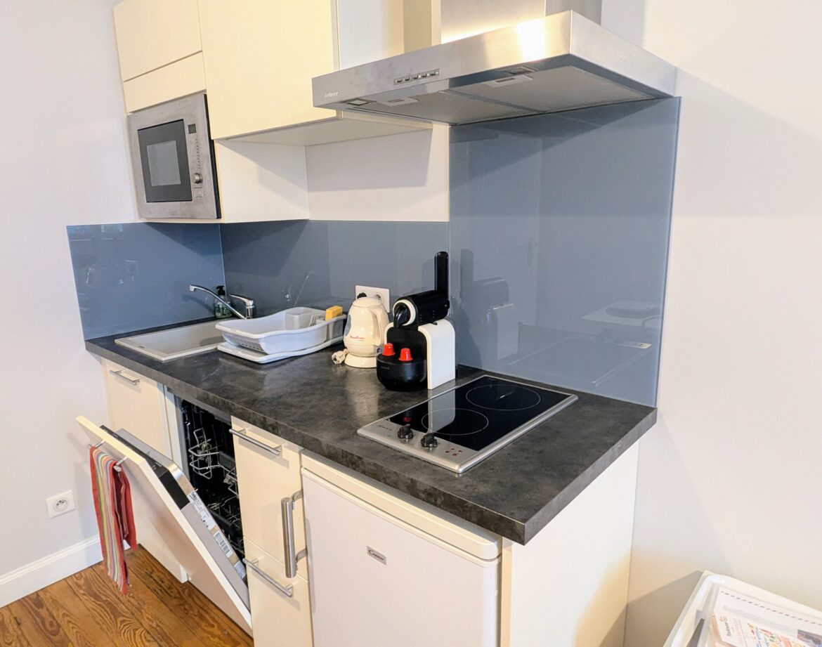 Une cuisine américaine entièrement équipée (réfrigérateur, four micro-ondes grill, hotte, lave-vaisselle, vaisselle et ustensiles).Des produits de base (sel, sucre, huile, vinaigre) ainsi que les produits d’entretien sont à votre disposition.